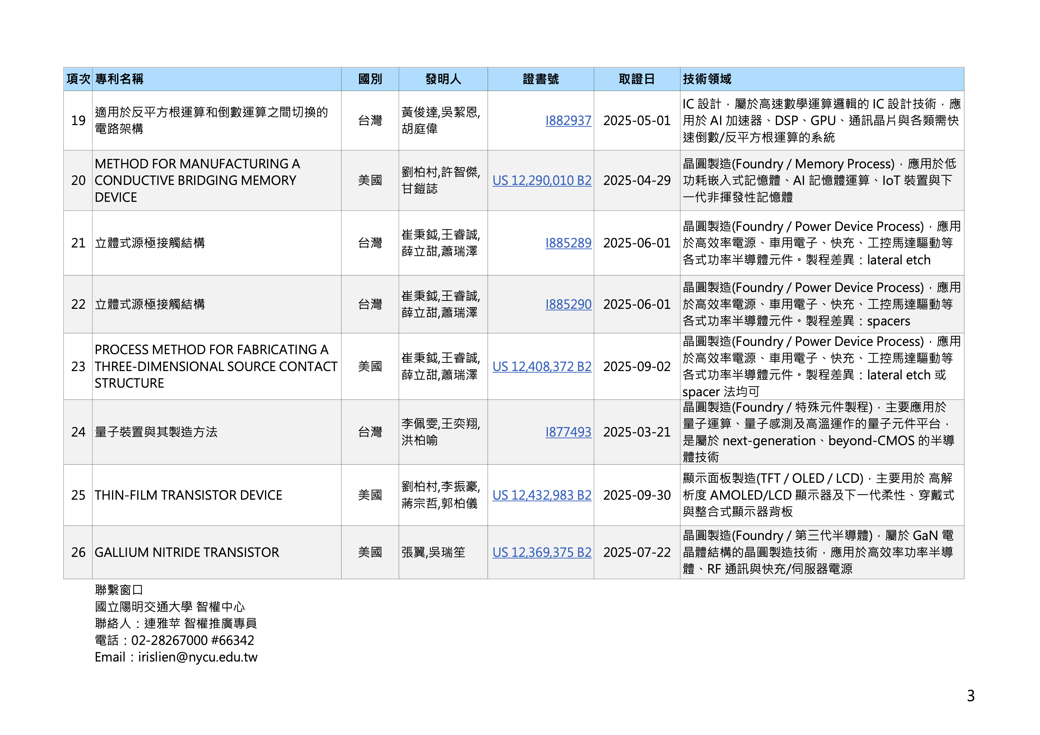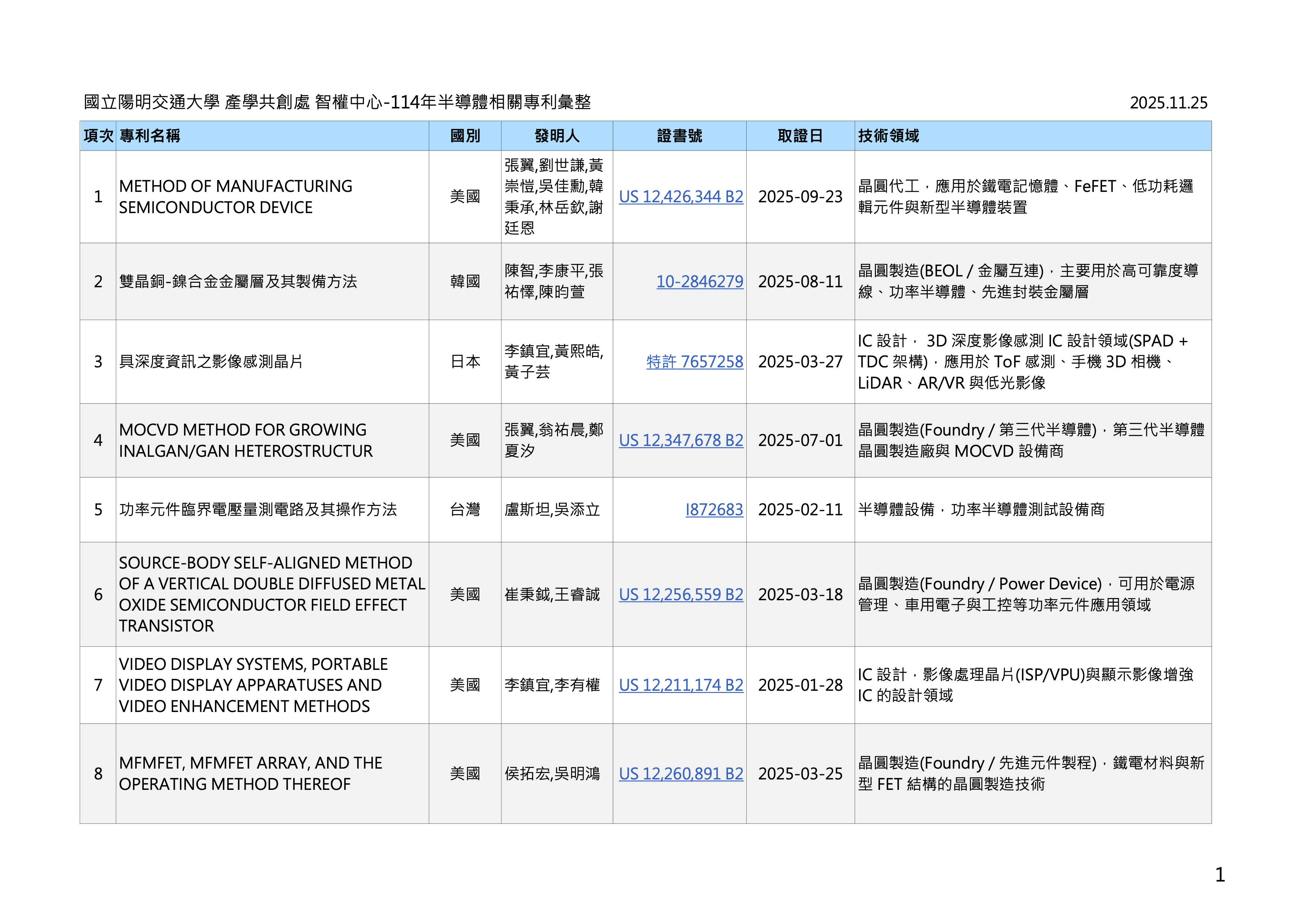 「114年度半導體相關專利彙整」 國立陽明交通大學 產學共創處 智權中心